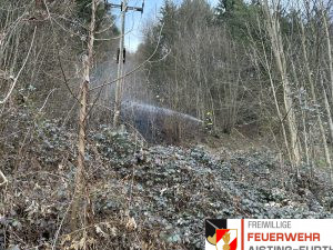 Am Nachmittag des 25. März 2026 wurden wir um 15:32 Uhr gemeinsam mit der FF Schwertberg zu einem Brandeinsatz im Josefstal alarmiert. Beim Eintreffen der ersten Kräfte stellte sich heraus, dass das Feuer von einem brennenden Baum bereits auf den angrenzenden Waldbestand übergegriffen hatte. Aufgrund der raschen Ausbreitung im Waldgebiet wurden umgehend die Feuerwehren Poneggen, Winden-Windegg, Tragwein und Mistlberg nachalarmiert. Besonders fordernd gestaltete sich bereits die Anfahrt: Ein schmaler, teils verwachsener Zufahrtsweg und das extrem unwegsame Gelände verlangten den Maschinisten und der Mannschaft alles ab. Um die Brandbekämpfung sicherzustellen, bauten wir eine stabile Wasserversorgung auf. Mittels Tauchpumpen förderten wir Wasser direkt aus der Aist zu unserem Fahrzeug, welches wiederum das TLF Schwertberg kontinuierlich speiste. Der Fokus lag zu Beginn auf einem umfassenden Löschangriff mit mehreren C-Rohren. Hierbei wurde unter anderem ein gemischter Atemschutztrupp der Feuerwehren Aisting-Furth und Poneggen eingesetzt. Parallel dazu wurden im steilen Gelände Nachlöscharbeiten mit dem Löschrucksack und Feuerpatschen durchgeführt, um Glutnester gezielt abzulöschen. Um sicherzugehen, dass keine versteckten Gefahrenquellen im Waldboden verblieben, wurde der Bereich abschließend akribisch kontrolliert. Unter dem Einsatz mehrerer Wärmebildkameras sowie einer Drohne aus der Luft konnte das Gelände final freigegeben werden. Nach dem erfolgreichen Abschluss der Arbeiten rückten wir wieder ins Feuerwehrhaus ein und stellten die Einsatzbereitschaft her. |